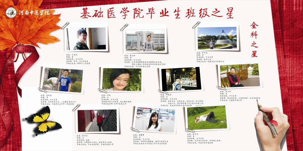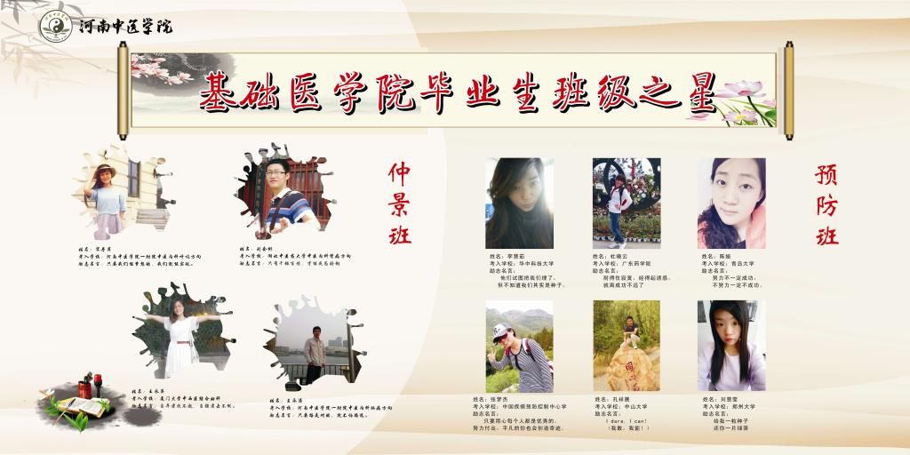 20名优秀毕业生中有在考研方面表现突出的考入北京中医药大学中日友好医院的杨振寰和徐曼曼,考入华中科技大学的李慧茹,考入中国疾病预防控制中心的张梦洁等;有在就业中表现突出的就职于河南科技大学第一附属医院的刘璞玉,就职于新郑市中医院的王尚祎;有在基层乡镇医院服务的杭山松、范洪兴等;有在班级建设方面表现优异的杜晓云、刘会彬等。我们整理出他们的个人姓名、照片、考入学校或工作地点、励志名言和感悟在展板上和院系微博、微信中加以展示,并组织各专业班级之星走向低年级学生班级中为低年级在校生传授学习、考研、就业、班级建设、社会工作等方面的经验,激励他们尽快成才。