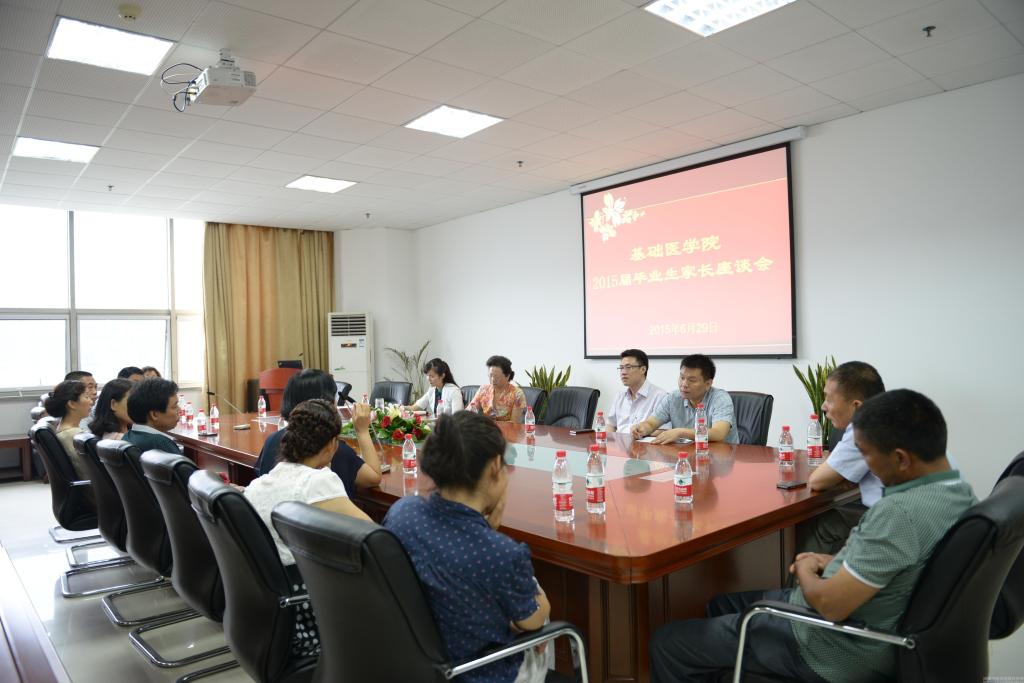 詹向红院长首先代表学院党委、行政和学校全体师生对毕业生家长长期关注、支持学校发展表示感谢!对学生们顺利毕业表示衷心祝贺!希望各位家长能借座谈会的机会,多向学校提出建议和意见,帮助学校发展。随后朱平生副书记、高剑峰副院长、曹珊副院长分别从基础医学院的人才培养思路、方法、成效、本届学生的就业情况;教育教学开展情况、学科建设、专业设置等方面作了详细的汇报。