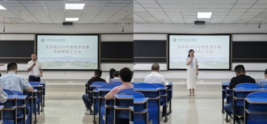 本网讯(文图/殷萌琪)为迎接新学期,明确发展方向,凝聚育人合力,保障学院各项工作有序推进,医学院于2025年8月31日下午在教学实验大楼4楼阶梯教室召开2025年秋季学期全体教职工大会。学院党政领导班子及全体教职工共同参会,开启新学期的奋斗征程。会议由学院党委书记高剑峰主持。