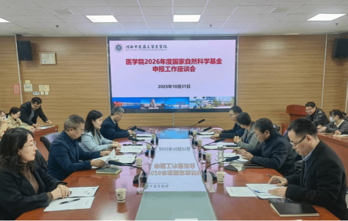 本网讯(文图/郑关民)10月31日上午9点,医学院在教学实验楼A447会议室召开2026年度国家自然科学基金(以下简称国自然)申报工作座谈会。副校长张振强,科学技术处处长王永霞、副处长刘瑞新,重大项目管理办公室主任王潘到会指导;医学院党委书记高剑峰、院长曹珊、副院长李寒冰及30余名科研骨干参会。会议由曹珊主持。