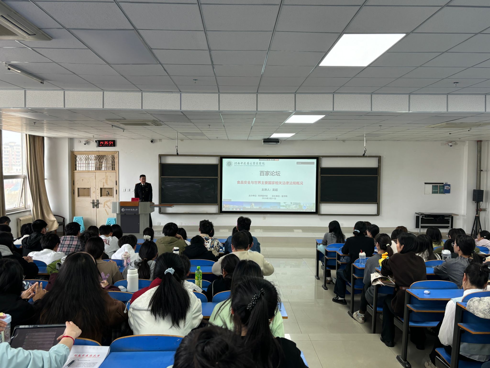 本网讯(文/徐雨童 王鸿飞 图/李想 李世宇)为扎实推进食品卫生与营养学学科建设,提升相关专业学生的国际视野、法规认知与专业素养,2026年3月31日,由科技处主办、医学院承办的“百家论坛”在教学实验楼四楼阶梯教室举办。郑州海关所属漯河海关副关长吴超应邀作题为《食品安全与世界主要国家相关法律法规概况》的学术讲座。医学院党委副书记孙俊波、副院长李寒冰、公共卫生与预防医学教研中心主任裴兰英以及科研办、学工办教师代表通过线上线下结合的方式参会。讲座由李寒冰主持,医学院食品卫生与营养学专业学生及全校学生代表共同参与此次学习交流。